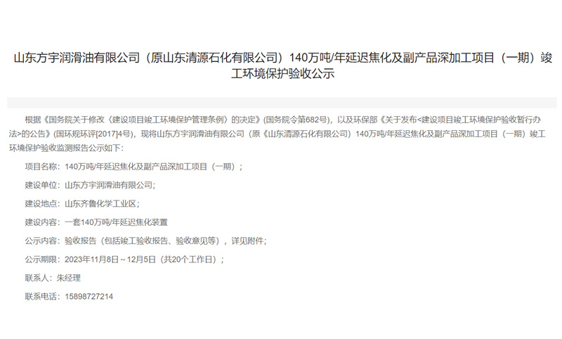 山東清源石化有限公司40萬噸/年變壓器油技改項目(一期)竣工環(huán)境保護(hù)驗收公示